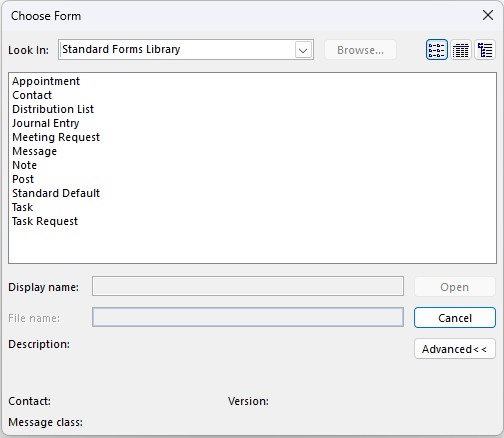 When you need to send one of these templates, click the Choose form icon in the Quick Access Toolbar, click Browse, then find the folder where you saved the .oft file. Double-click the form to open it. After you’ve browsed once to the location, it will show up in the ‘Look in:’ dropdown, so you don’t have to browse again.