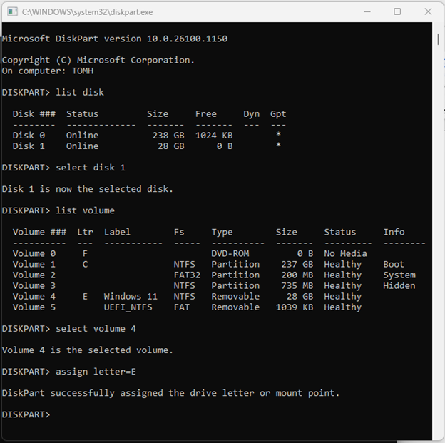 Type ‘assign letter=E’ to assign a drive letter to the volume. In my example below, the drive is already labeled E, but if the disk is not recognized in File Explorer, the Ltr column will be blank.
